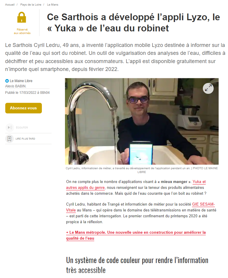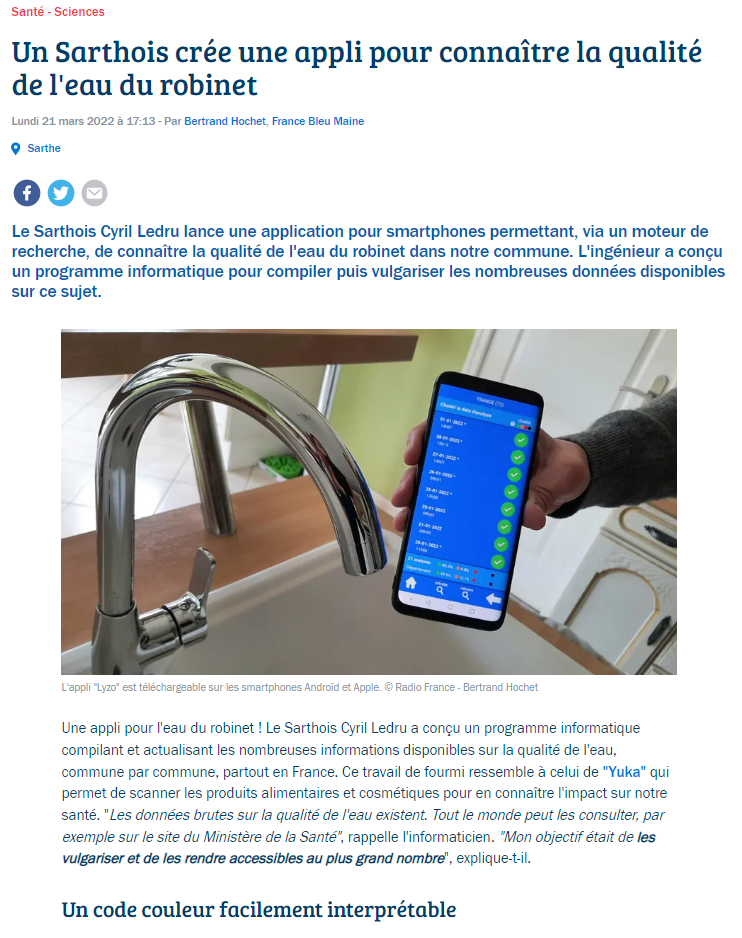 "Bravo pour votre appli Android Lyzo ! Elle est remarquable aussi bien par ses fonctionnalités que par la convivialité de son interface. De plus elle met en valeur des données peu faciles à utiliser".